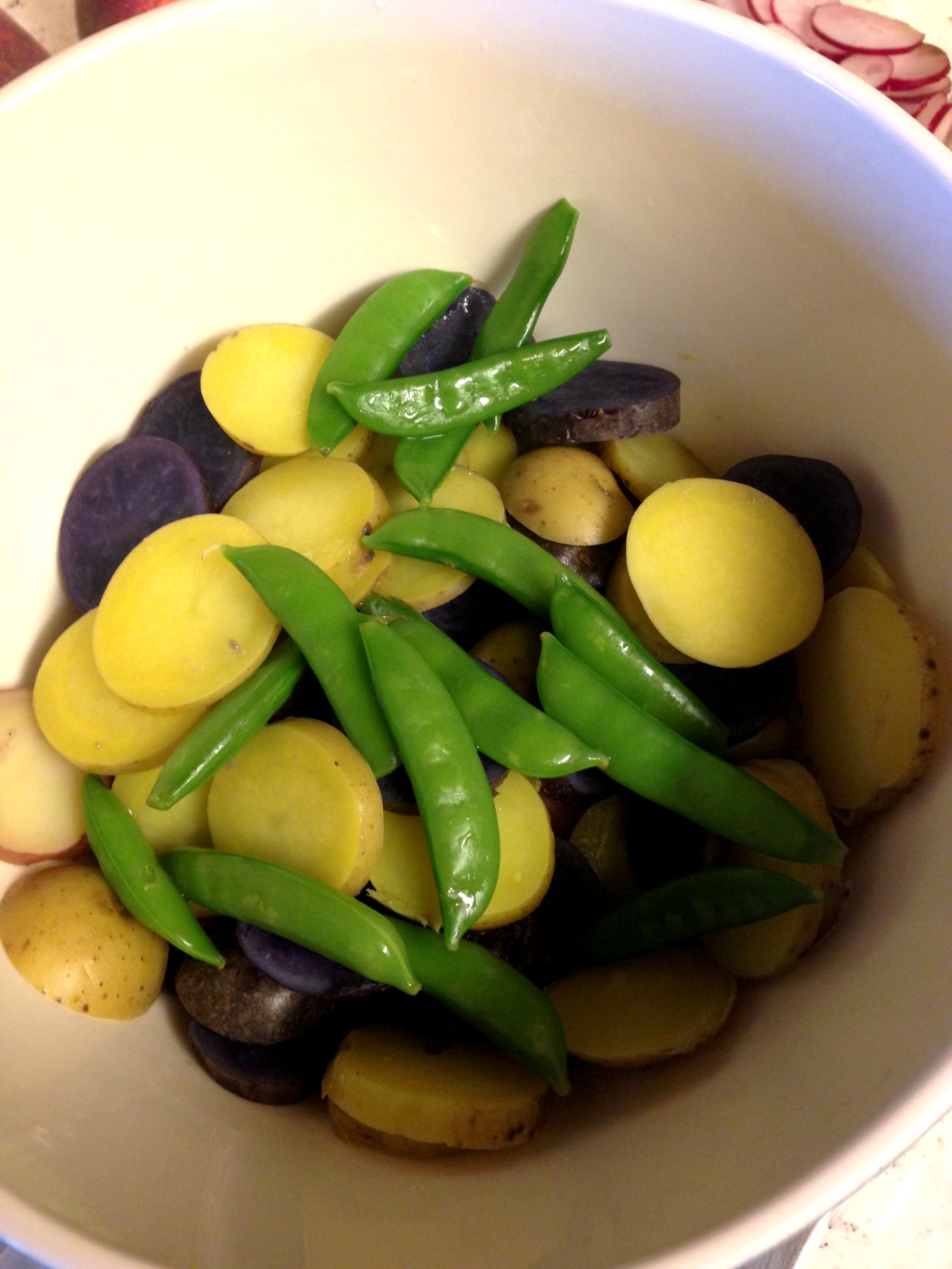 - When the potatoes are cool enough to handle, cut them in quarters or in half, depending on their size. Place the cut potatoes in a large bowl. While the potatoes are still warm, pour enough dressing over to coat them completely.